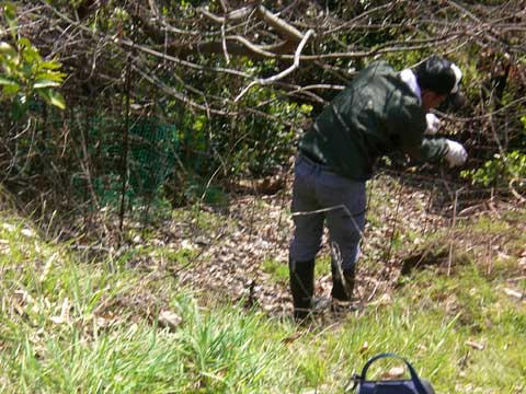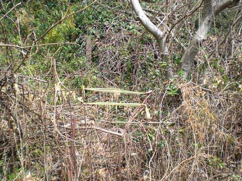いろいろと周辺を見て回ったが、イノシシの進入路が確定できないので、可能性の高い部分にひもを張ってみた。