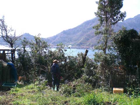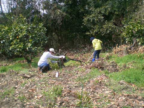 今年は田口早生を5本と、イノシシに抜かれてしまった石地、由良早生各1本を植えるため、妻と娘で除草と苗床を作ってもらう。